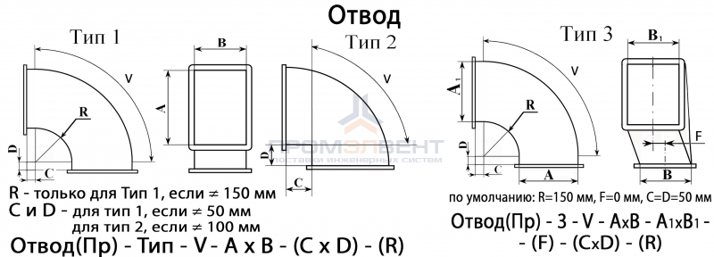 Отводы изготавливаются в трех исполнениях Тип 1, Тип 2, Тип 3.